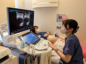 当クリニックでは妊婦健診の際に、お母さんと共にお腹の中の赤ちゃんが元気かどうかを確認する為に超音波による検査で、赤ちゃんの心拍や胎位(逆子等)の確認、推定体重等を計測し、それと共にお母さんの状態と経過のチェックを行っております。
